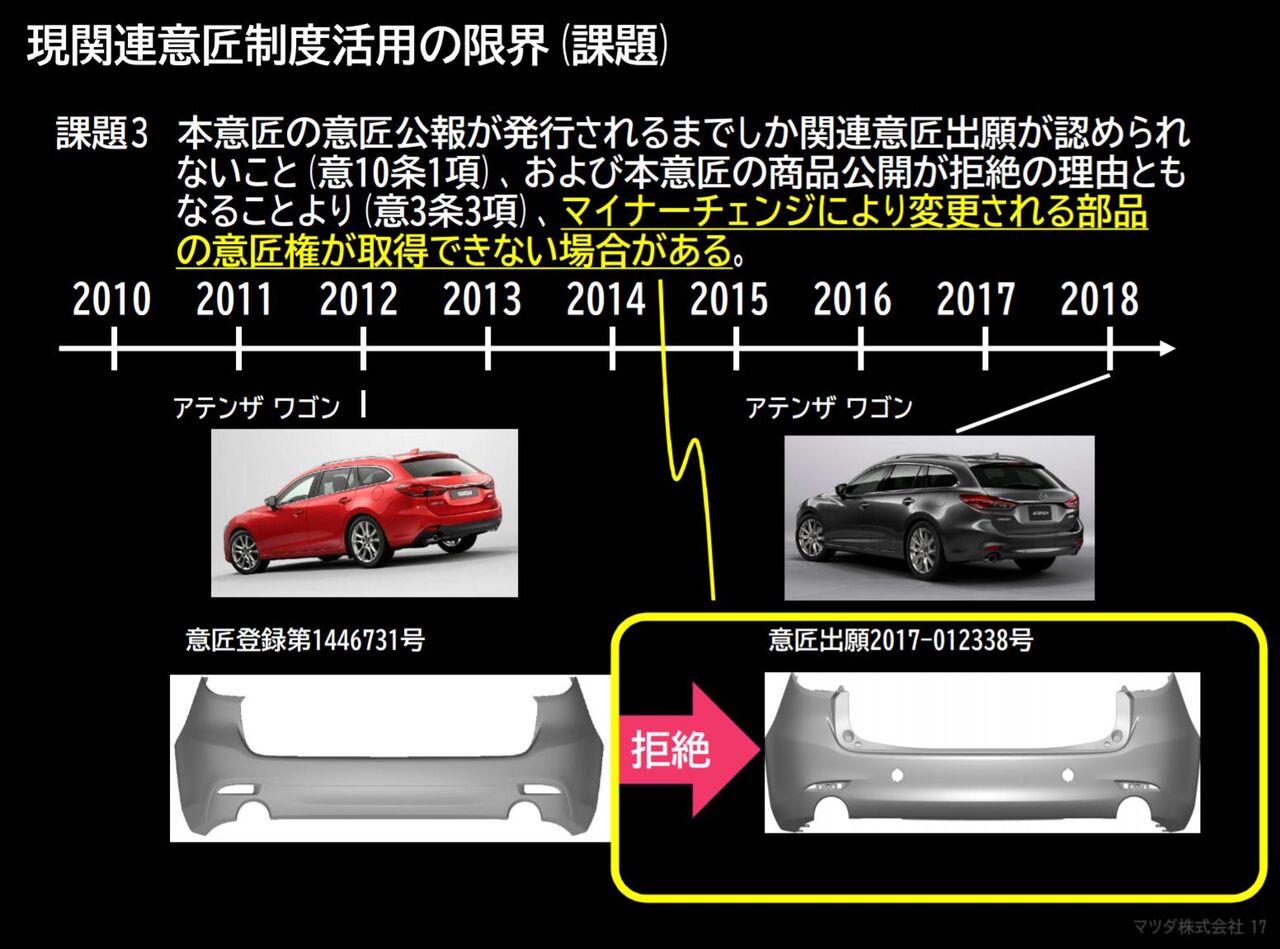 この資料にはマツダのデザイン戦略についてが掲載されているんですが、その中に「2018年現在の意匠制度の課題」という内容がありました。少し昔の資料ですが、とても勉強になりました。