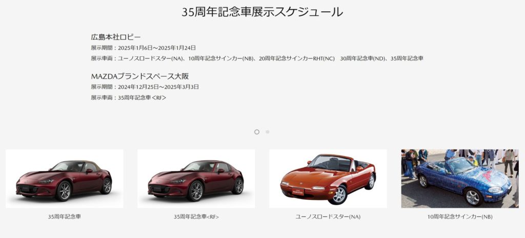 本日からロードスター35周年記念車特集ページが公開されており、ロードスター35周年記念車の展示車両情報が掲載されていました。