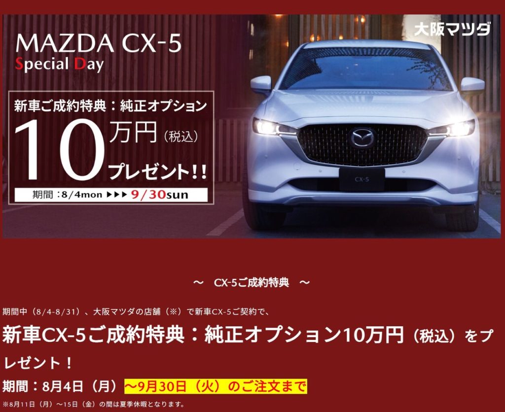 画像引用元:CX-5 Special Day! 純正オプション10万円プレゼント! ~2025年9月30日の受注まで~ _ 大阪・関西でマツダ車のご用命は大阪マツダ販売株式会社へ