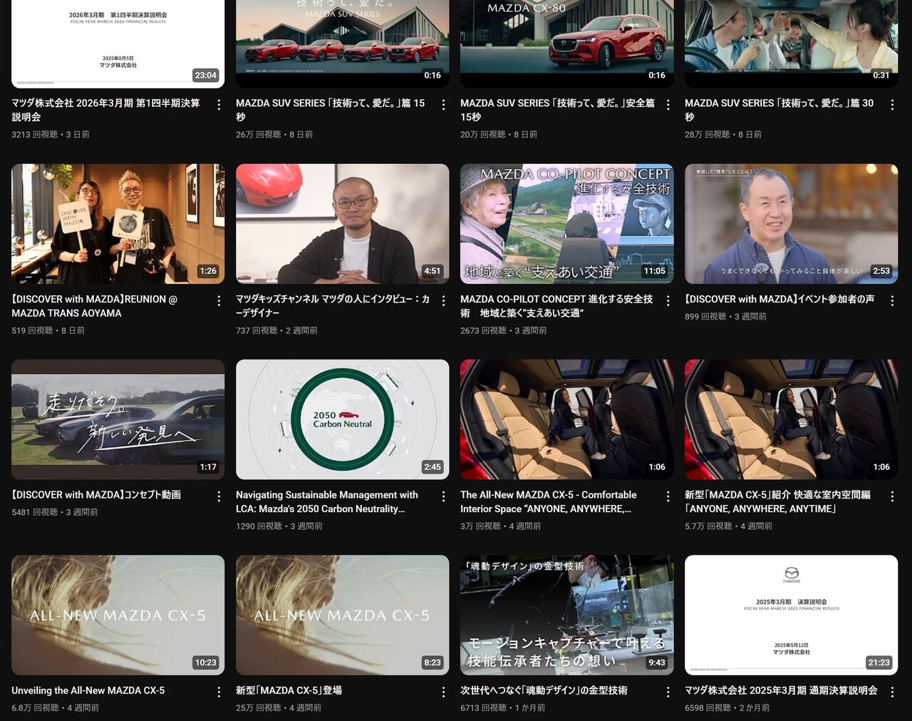 マツダ公式アカウントの投稿動画一覧を見てみると、意外な結果がわかりました。