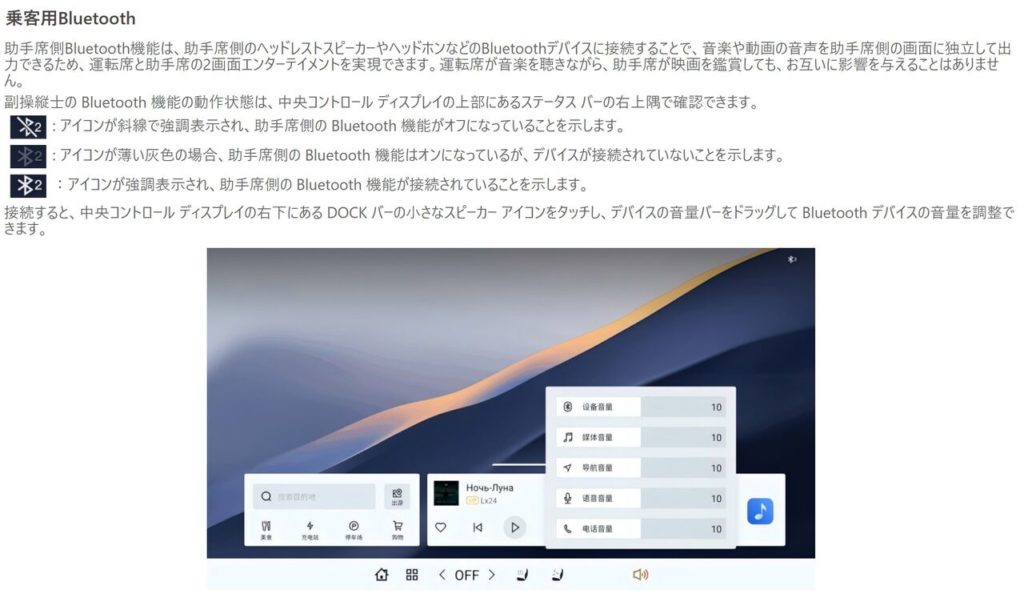 こちらの説明によると「助手席側Bluetooth機能は、運転手と助手席の2画面で音楽や動画の音声を独立して出力できる」と書いてありました。これまた面白い機能ですねぇ。