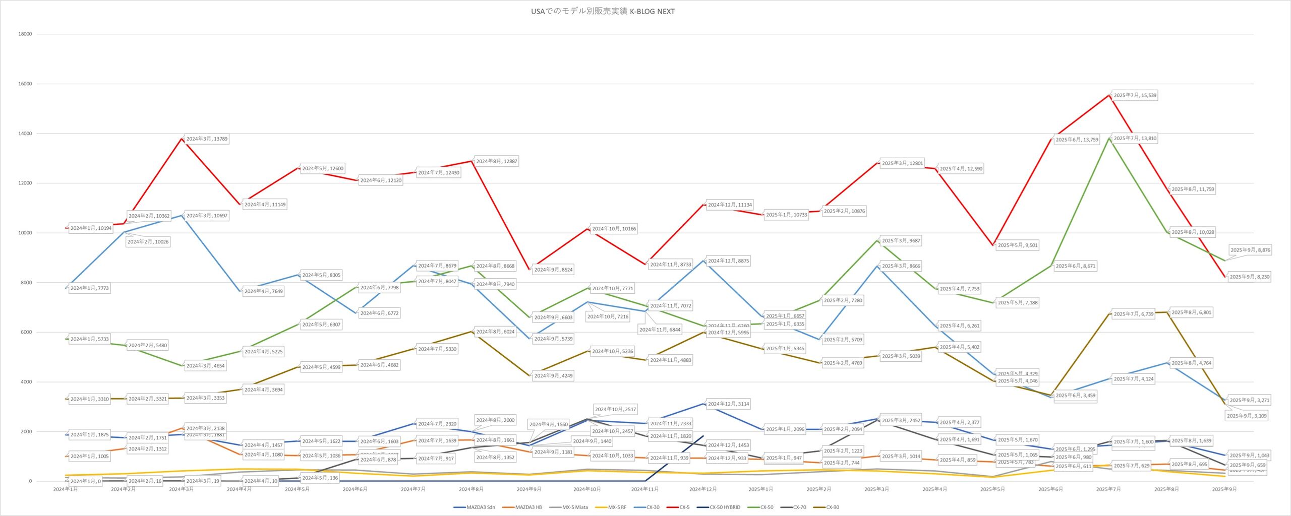 CX-50が9月としては過去最高となりましたが、それ以外の主力モデル(CX-5、CX-90)がガクッと減少してしまっているのが辛いところですね。関税問題で仕方がない部分がありますので、これからの巻き返しに期待です。