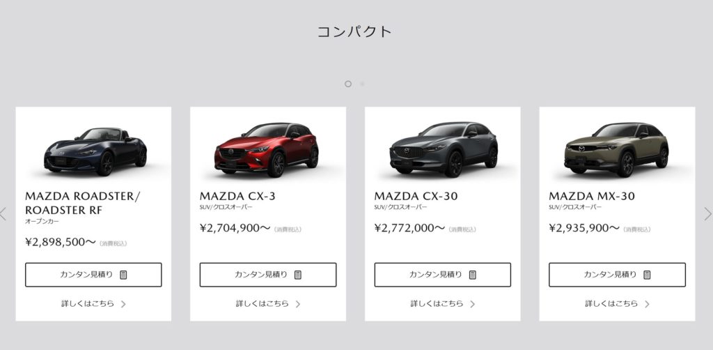 残念ながら「MAZDA2」と「MAZDA3」の存在は、敢えてスクロールしないと見れないようになっています。あの販売台数が極めて低い「MX-30」よりも後ろというのが悲しいですね。これはもしかすると、MAZDA2とMAZDA3が廃止されても問題ないようなデザインに出もしているのでしょうか。