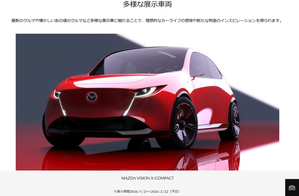 新たに「MAZDA VISION X-COMPACT」が展示されているそうです。展示期間は「2026年1月21日~2026年2月22日」となっており、約1ヶ月間X-COMPACTをじっくりと観察することができるみたいですね。
