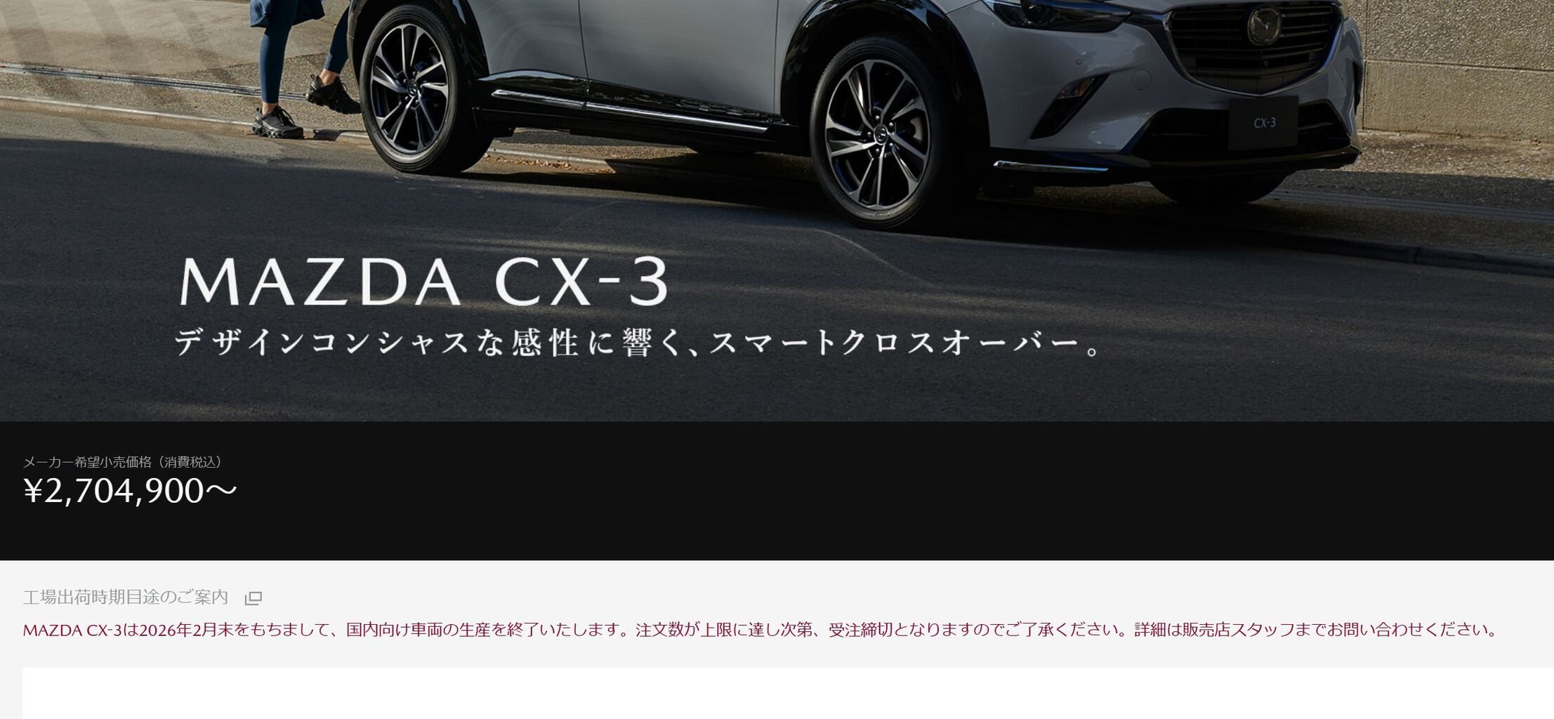 こちらには「MAZDA CX-3は2026年2月末をもちまして、国内向け車両の生産を終了いたします。注文数が上限に達し次第、受注締切となりますのでご了承ください。詳細は販売店スタッフまでお問い合わせください。」と掲載されていました。