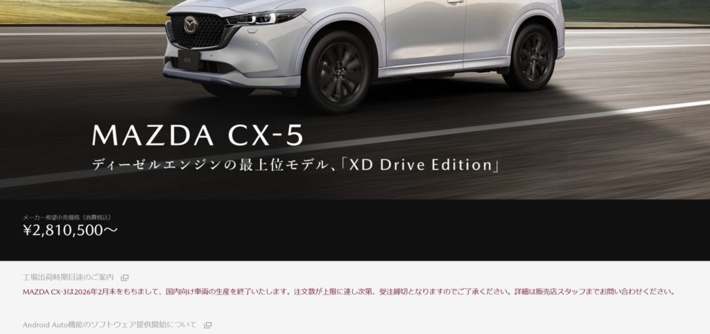 ただ、現行CX-5も3月末でガソリンエンジン搭載モデルが販売終了となる予定ですので、それと何か関係があるのでしょうか。それとも、ただの設定ミスなのか。
