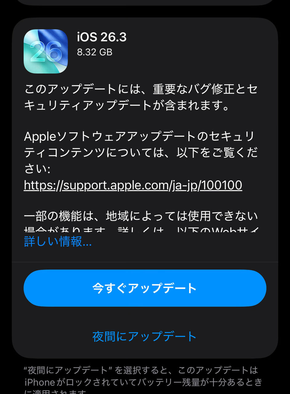 つい先日「iOS 26.2.1」が配信開始されたなと思っていましたが、さっそく次なるバージョン「iOS 26.3」が登場しました。iOS 26.2.1でもまだまだ多くのバグが残っており、海外ではちょっとした話題になっていたみたいです。なので、少しでもバグが修正されていると良いですねぇ。