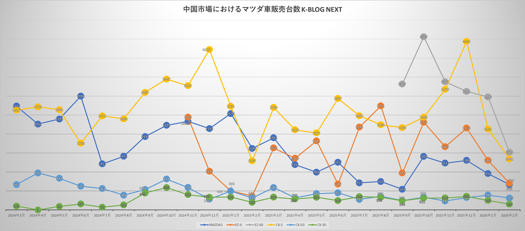頼りのEZ-60とEZ-6、そしてCX-5が急角度で減少したのが怖い。今後、前月以前のような販売台数に戻るのかが勝負だと思いますね。ただ、CX-30やCX-50が影響を受けていないのが面白い。