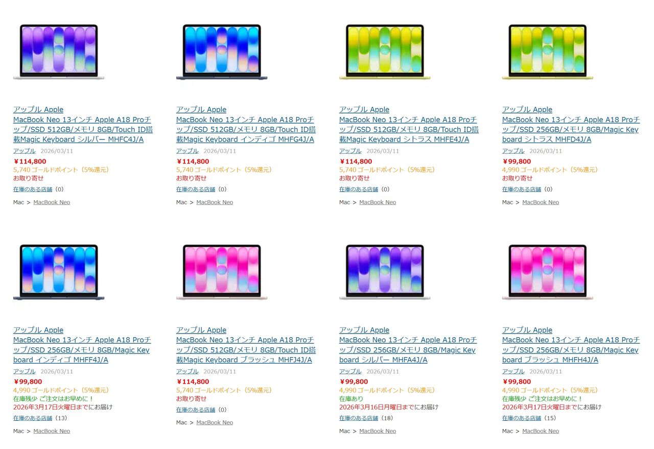 前回、MacBook Neo(512GB)が売り切れになっていました。