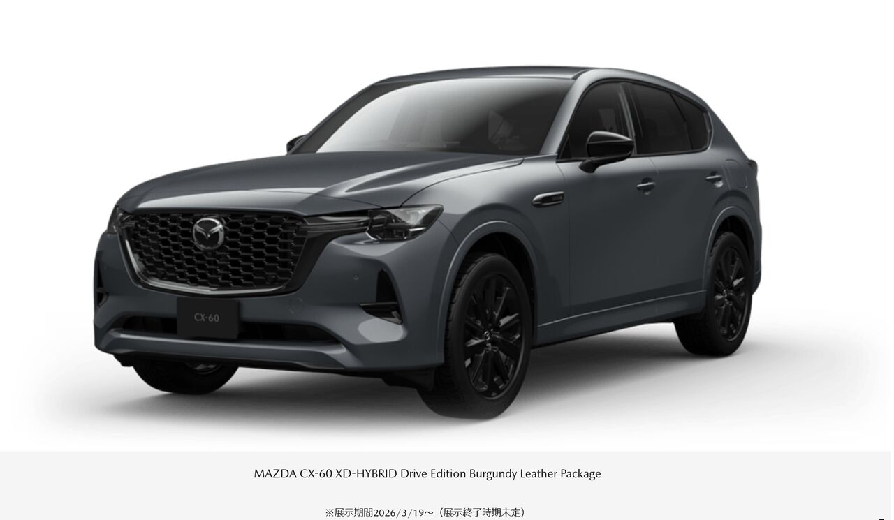 明日から、2026年商品改良CX-60の「XD-HYBRID Drive Edition Burgundy Leather Package」が展示されるようです。今回の商品改良で目玉となる「ポリメタルグレー」と「バーガンディ内装」の組み合わせとなっていますので、これは見所満載ですね。