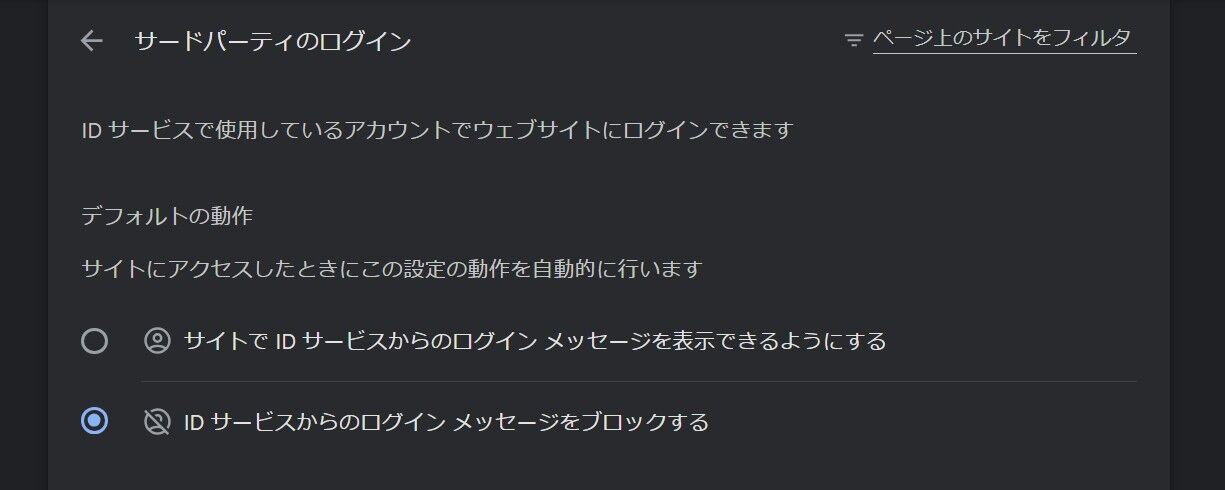 この機能をOFFにするには「設定→プライバシーとセキュリティ→サイトの設定→コンテンツ内の「その他のコンテンツ設定」→サードパーティのログイン」まで辿り着かないといけません。そもそも、この機能の名前をなんなのかを調べるのにも時間がかかりますよね。