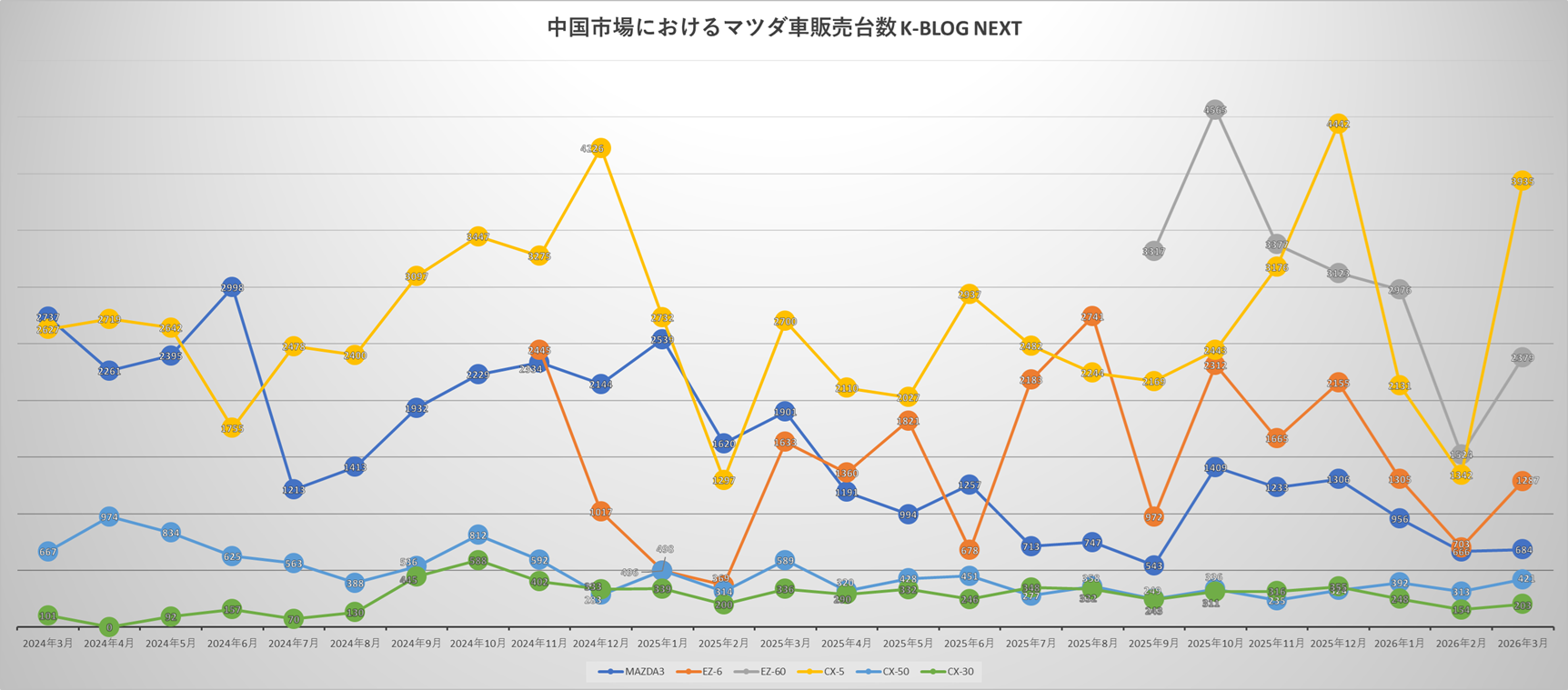 そして、以前は中国市場におけるマツダの主力だった「MAZDA3」は3ケタ台が当たり前の時代になりました。ここまで台数が減少するとかなり寂しいですね。その代わりにEZ-6が活躍してくれることを祈りましょう。