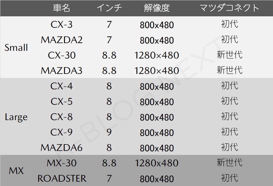 今回は趣向を変えて「スモール群」と「ラージ群」、「MX」というグループ別に分けてみました。こうして分けてみると、ラージ群は既に全モデルのディスプレイ大型化が完了しているのがよくわかります。スモール群は「MAZDA2」と「CX-3」、MX群では「ROADSTER」が7インチのままになっています。